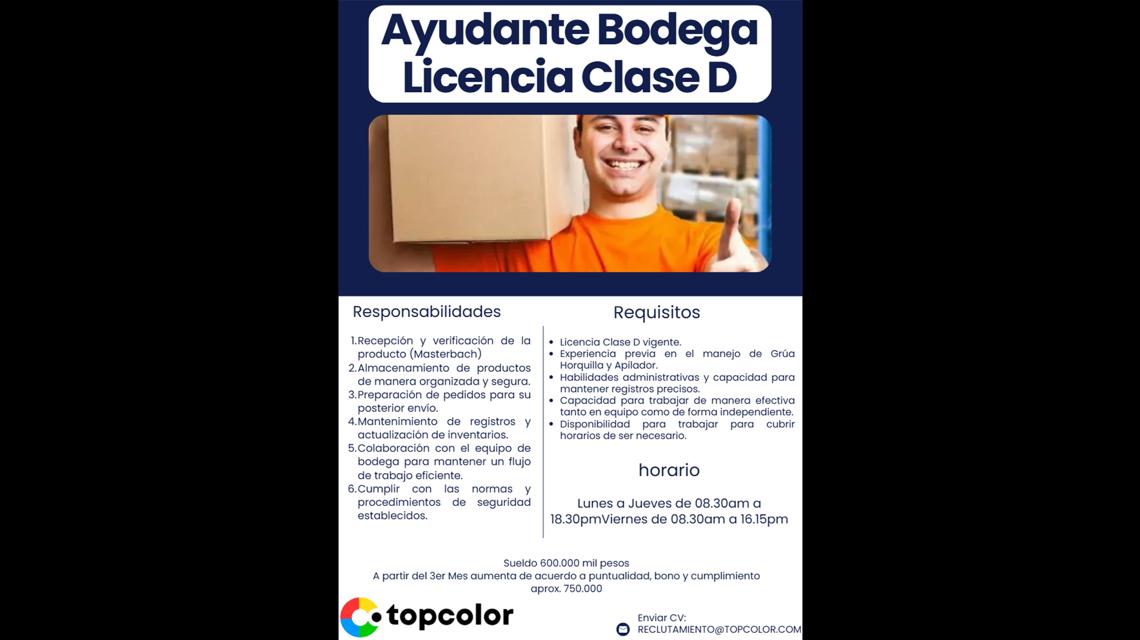 Ayudante Bodega Licencia Clase D - Turno Administrativo